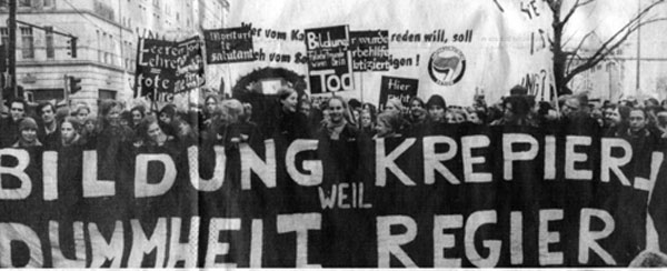 "Die Sprache des Streiks - Sprache im Streik" Darin haben wir beobachtet, wie Sprache zum Streiken benutzt - und teilweise auch selbst zum Streiken gebracht wurde. Wir haben dazu Vollversammlungen der Berliner Universitäten, Flugblätter, Demoplakate, Streikzeitungen, die Streikseiten im Internet, Zeitungsartikel und Nachrichtenbeiträge gesammelt und ausgewertet. Herausgekommen ist, neben vielen heftigen Diskussionen über politische Sprachstrategien, eine Liste von Wörtern, Sprüchen und Bildern, die in diesem Streik besonders gerne und mit besonderer Bedeutung benutzt worden sind. Einige davon wurden frisch erfunden!: Die sprachliche Kreativität der Streikenden (und auch der Damen und Herren Streikgegner) hat deutlich nicht mitgestreikt. Geplant war, auch ein Kleines Wörterbuch der Streiksprache zu schreiben, worin mindestens die wichtigsten Wörter aus der oben verlinkten Liste als Eintrag mit kurzer allgemeiner und streikbezogener Bedeutungsanalyse verbucht werden sollten. Leider ist es ein Fragment geblieben. Ein Blick lohnt sich trotzdem; - finden wir.