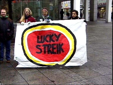 Belegt in Kommentartext FU:N vom 11. 12. 1997: Auf zahlreichen Aktionen und Demonstrationen diente Lucky Streik - auf Plakaten, T-Shirts und Autos - als emblematische Selbstbeschreibung des Studentenstreiks: selbstbewußt, kreativ, ironisch und sympathisch. In vielen Kommentaren zum Streik in Zeitung und TV, die das Stichwort Lucky Streik im Titel trugen, wurde es als Name für die gesamte Streikbewegung eingesetzt. Variationen von Lucky Streik, wie Ugly Streik und Angry Streik, transportierten Kritik am Konzept des Streiks, und trugen dazu bei, daß der Streik schwerlich auf einen einfachen Begriff zu bringen war. Variationen: